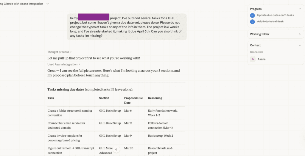 I decided to start with connecting my Asana to Cowork and seeing what it could do with a recent big project of mine. I had created a bunch of tasks for it but was unsure of what timeline to give myself. So I asked Cowork to help me there and see if I missed anything else.