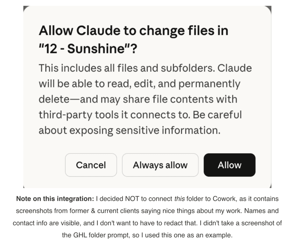 One note of caution is that you want to be really mindful of what you are giving Claude access to on your desktop.