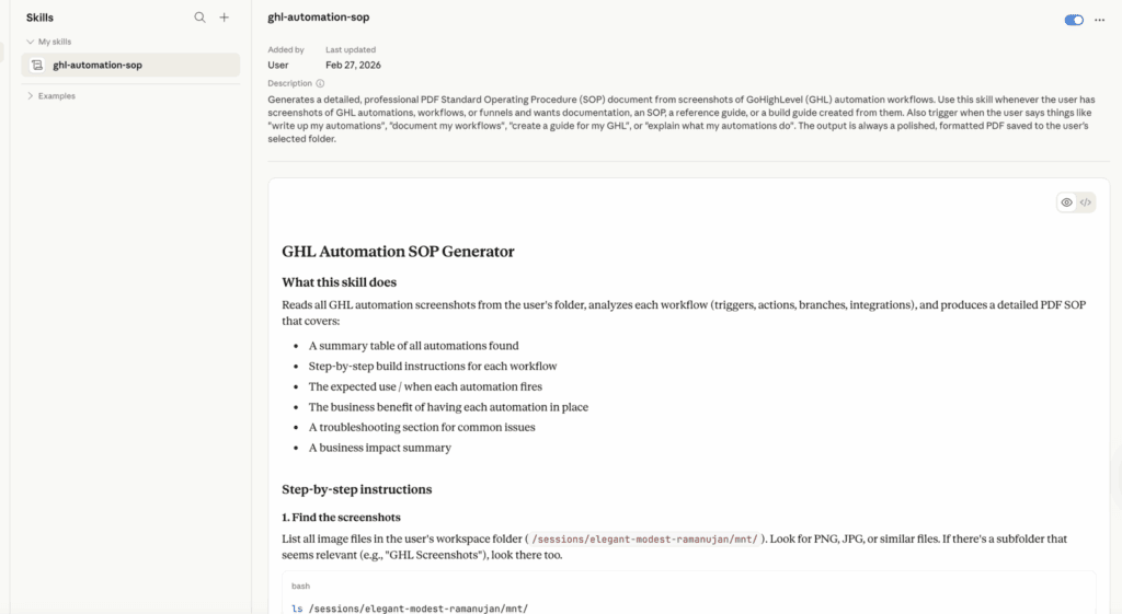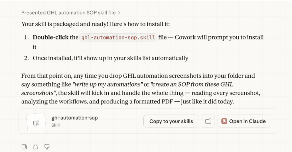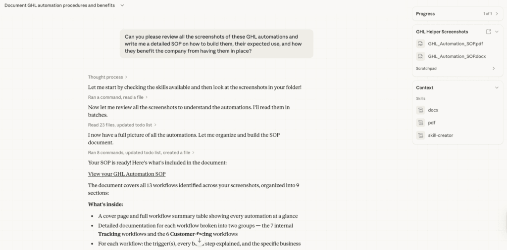 Next, I wanted to explore Cowork’s ability to think and put things together for me. I gave it a folder of 23 screenshots from other GHL workflow setups I’ve collaborated with other clients. With that, I wanted Cowork to write me an SOP to help me replicate this setup for a new client.