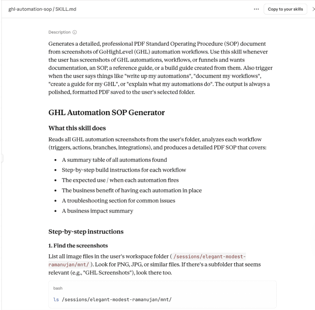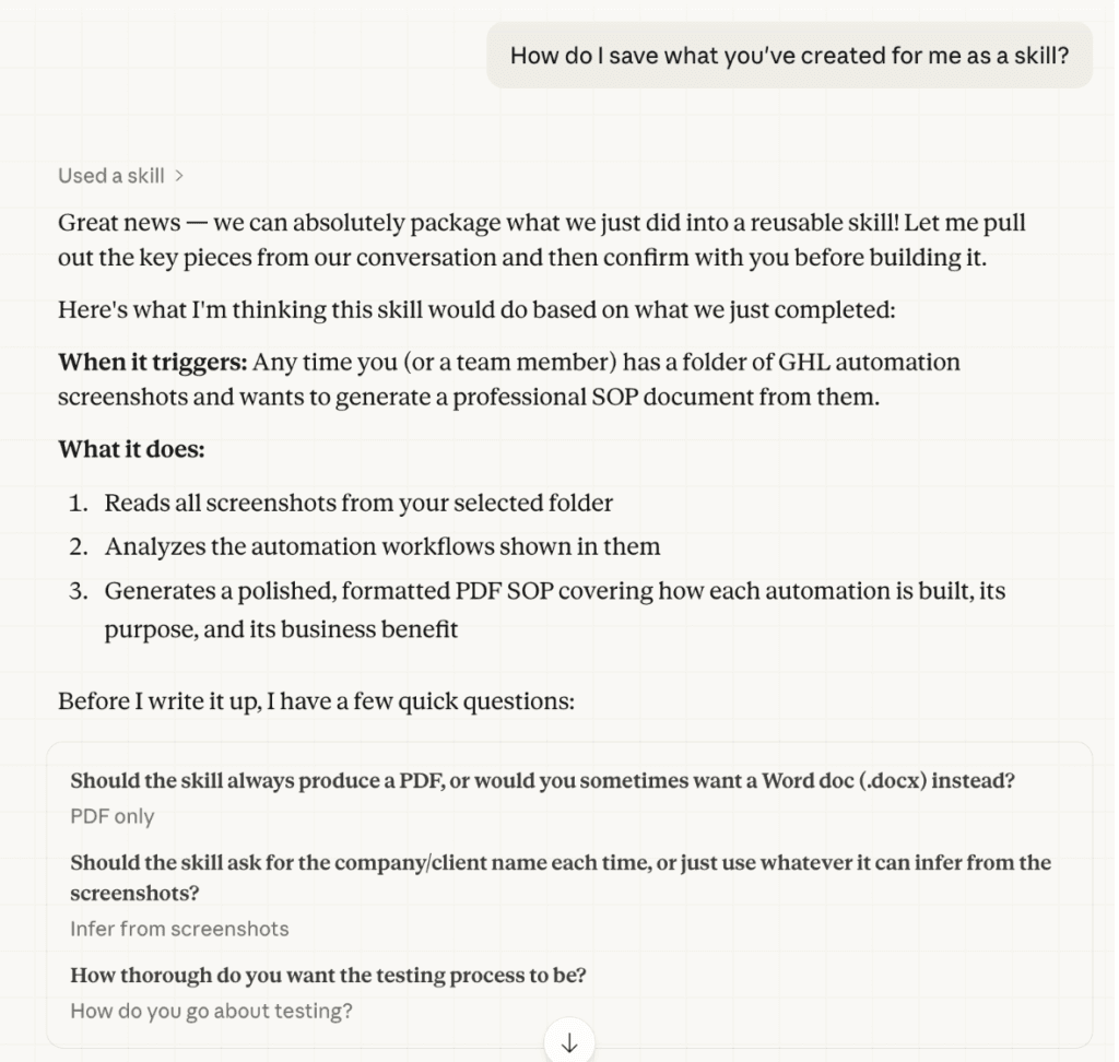 The really powerful part: Claude can summarize an entire conversation’s worth of context and export it as a .Skill file. So if you spent two hours working through exactly how you build an ad campaign or building a presentation, or creating a launch plan, Claude can crystallize all of that and save it as a skill, then reference and apply it automatically in future sessions without you having to re-explain anything.